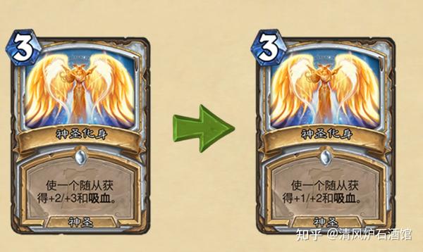 神圣化身这张牌在贫瘠之地里因为剑圣萨穆罗的原因,几乎成为牧师卡组里的固定组合,7费全体打3加回一大口血实在是太舒服了,现在削弱过后,连带着把牧师的清场能力也下降了,现在剑圣只能全场打2了,有可能很难完成清场的任务,虽然牧师还有像真言术·宴这样的buff手段,但是总归没有之前那么舒服了。